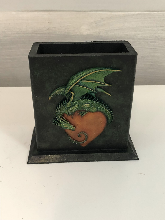 Dimensions : 11, 5 cm (hauteur), 8 cm (longueur du pot), 12 cm (longueur de la base), 3,4 cm (largeur du pot), 7 cm (largeur de la base), 0.8 cm (épaisseur du bois).