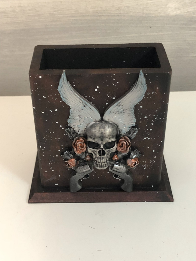 Dimensions : 11, 5 cm (hauteur), 8 cm (longueur du pot), 12 cm (longueur de la base), 3,4 cm (largeur du pot), 7 cm (largeur de la base), 0.8 cm (épaisseur du bois).